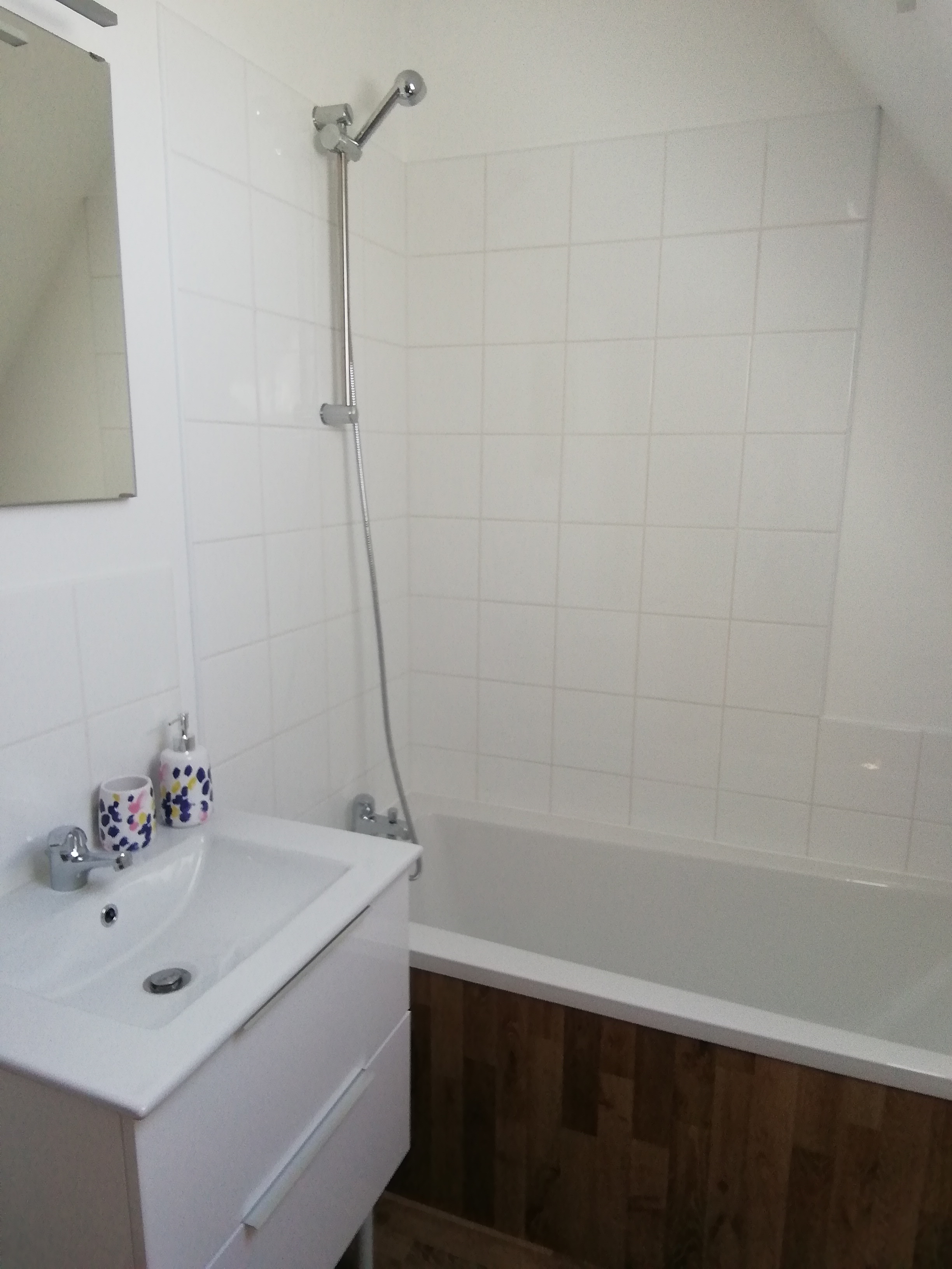 Fully fitted bathroom with bath and shower overhead. Sink with vanity unit.