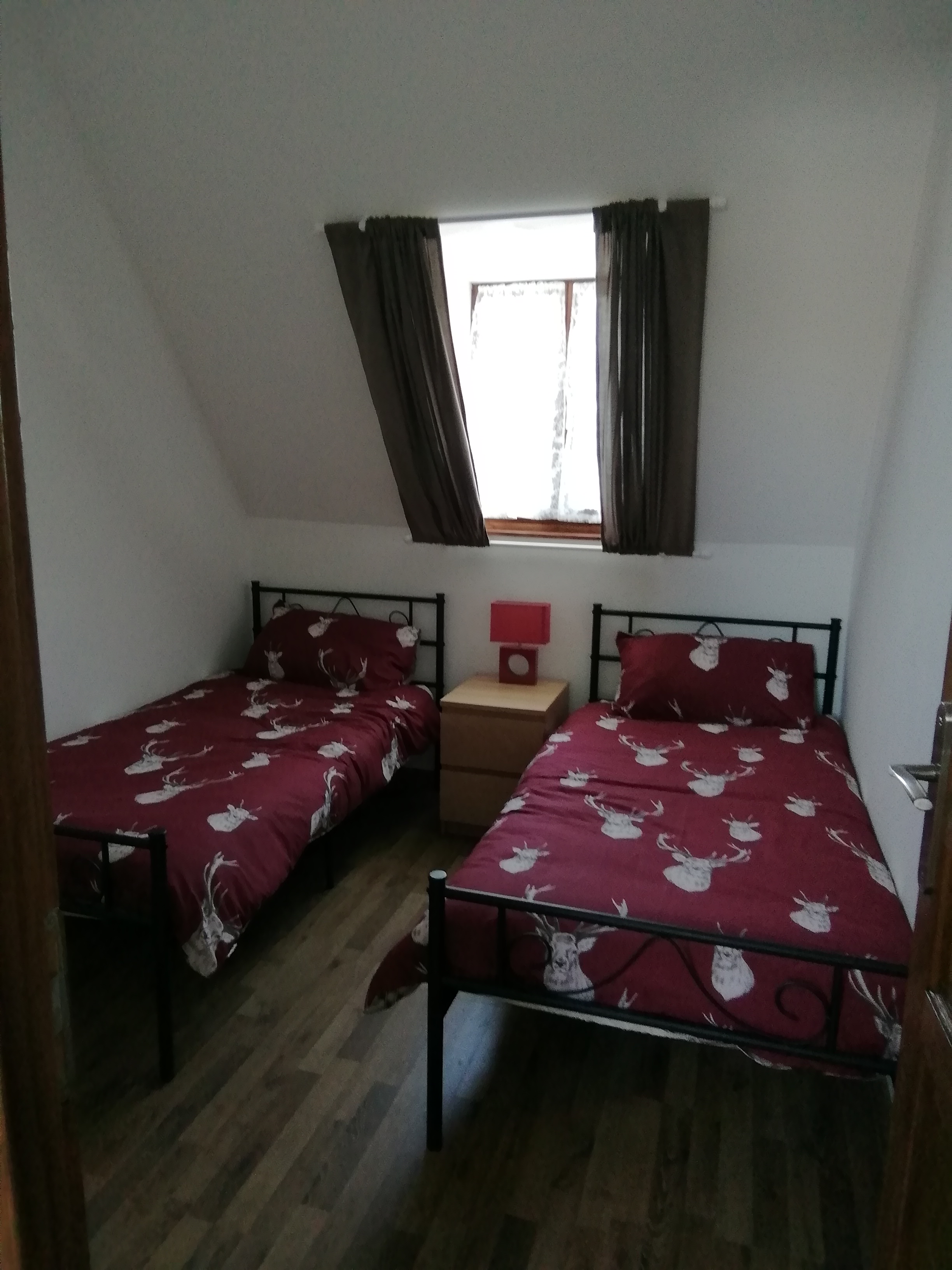 A twin bedroom again with bedside table and lamp and a further large chest of drawers.