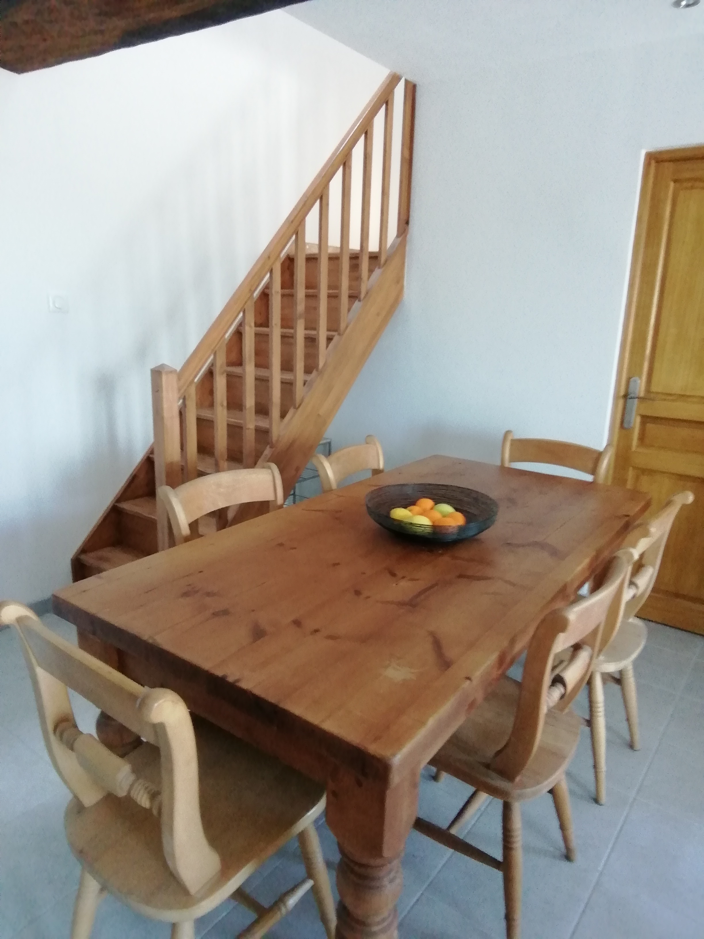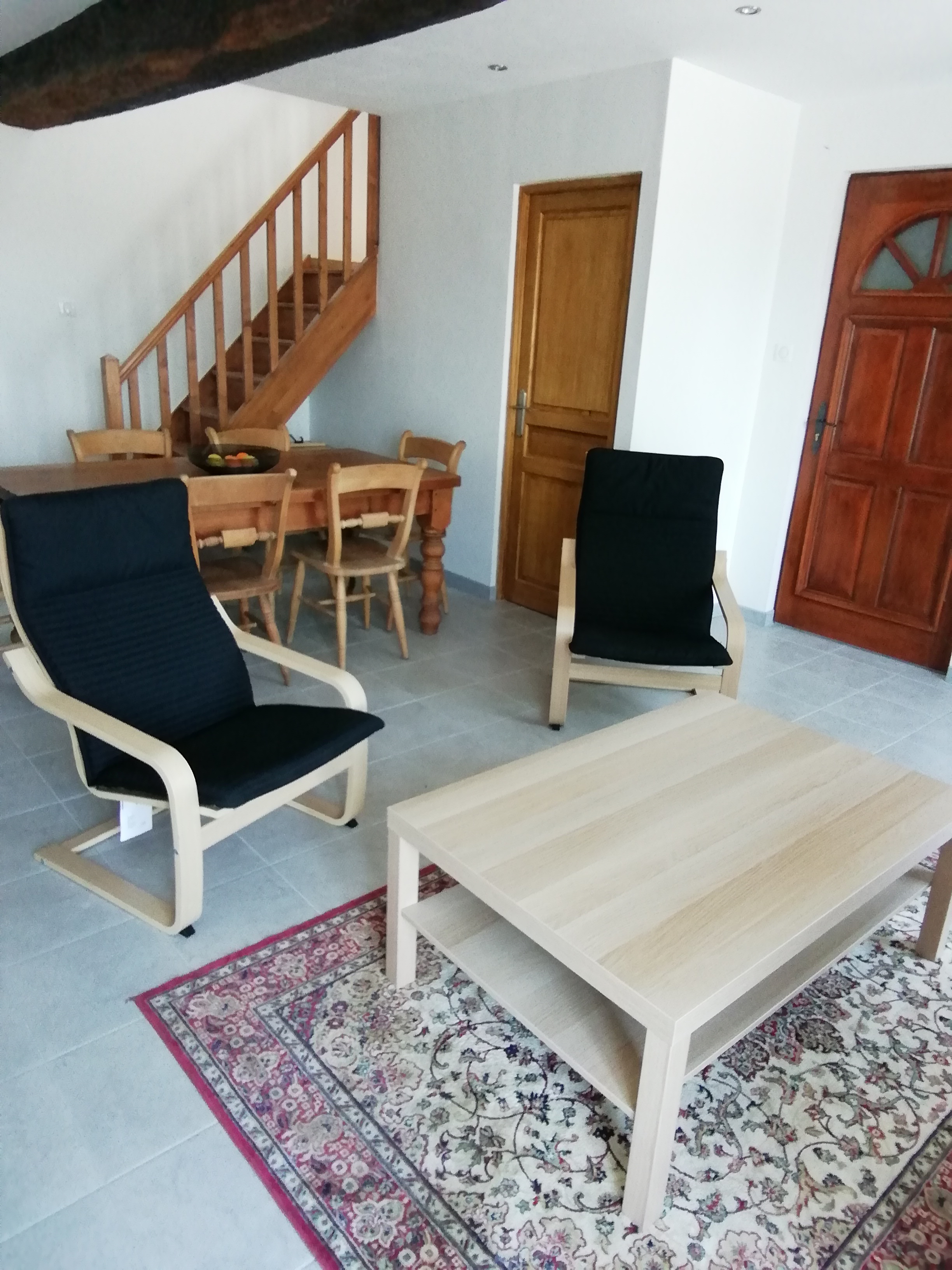 Two armchairs and a sofa, a dining table for 6. Fully fittred kitchen area with a full sized oven and hob, microwave, fridge freezer and all equipment required for a self catering holiday.